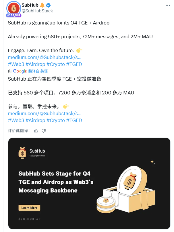 SubHub @SubHubStack 是一个信息推送平台,可以通过互动来获得空投份额,简单举个例子: