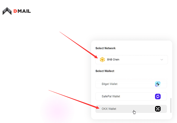 点击Creat 去Dmail网站,如下图所示,选择 BNB Chain链,连接OKX 钱包,消耗微量 $BNB 做Gas,即可注册成功 #Dmail 邮箱,然后返回Subhub 网站 https://t.co/IkgT4CBP9v