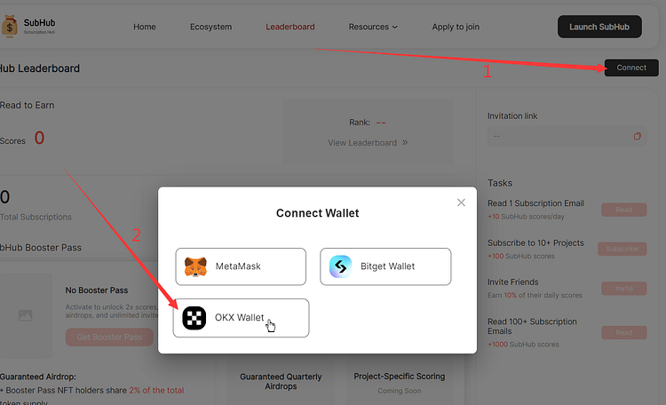 ②绑定钱包,完成页面右侧Tasks板块的阅读、订阅等任务赚取积分