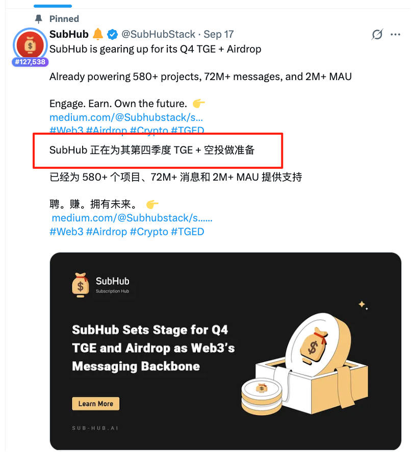 据说 @SubHubStack 十月份 Tge, 官方也明牌 7%空投给社区。现在可以从多角度撸空投,内容贡献+积分计划等
