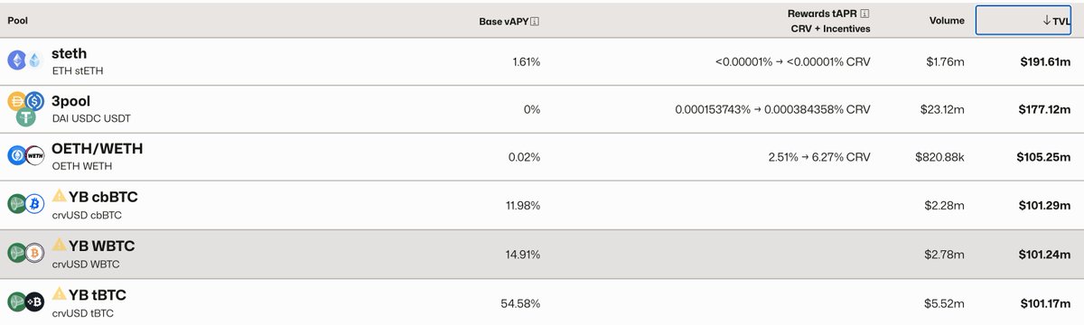 4. $crv - Curve Founder Michael新做的的Yield Basis马上就上币安了,除了共享一个Founder之外,你研究下Yield Basis的机制(或者回去看我之前发的Yield Basis贴)应该立马就能明白,这项目最大的利好其实是刺激crvUSD(因为要借贷crvUSD),然后变相的利好crv (YB的三个池子已经排进Curve TVL前6了)