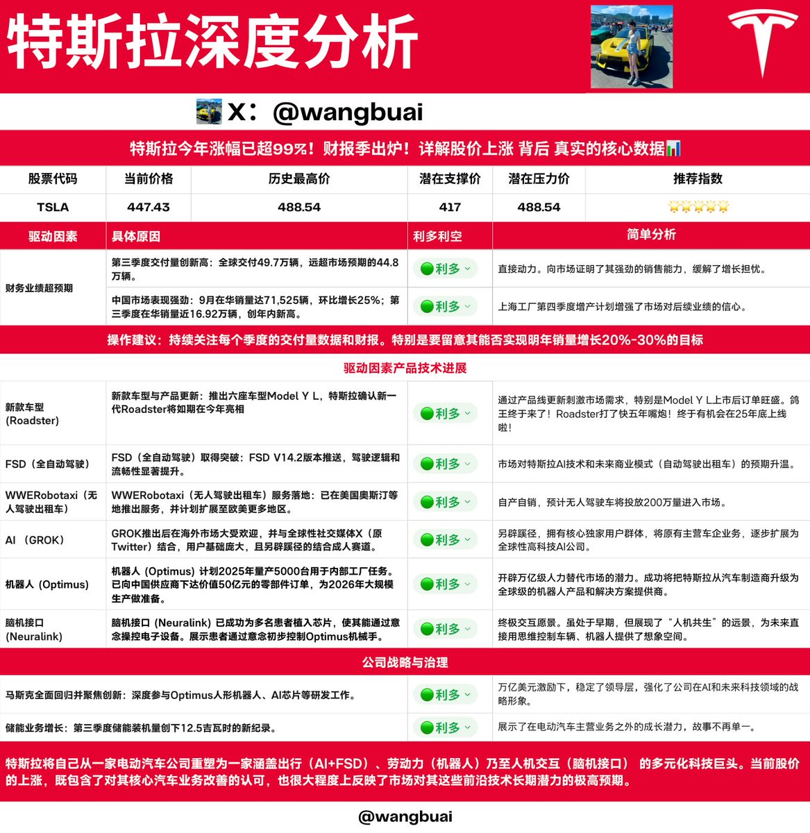 特斯拉 $tsla 的下一个短期高点就是11.6号股东大会马斯克一万亿薪酬通过。但这个大阳线拉盘绝对没有延续性,拉一波就会跌回来继续震荡为主。我认为2026年特斯拉都是反复拉锯战震荡为主,直到某一个时刻robotaxi的实打实营收高毛利的快速增长反映到财报里,大家意识到特斯拉未来的主要营收不再由电动车贡献,转变由AI贡献了,那个时候,波澜壮阔地上涨