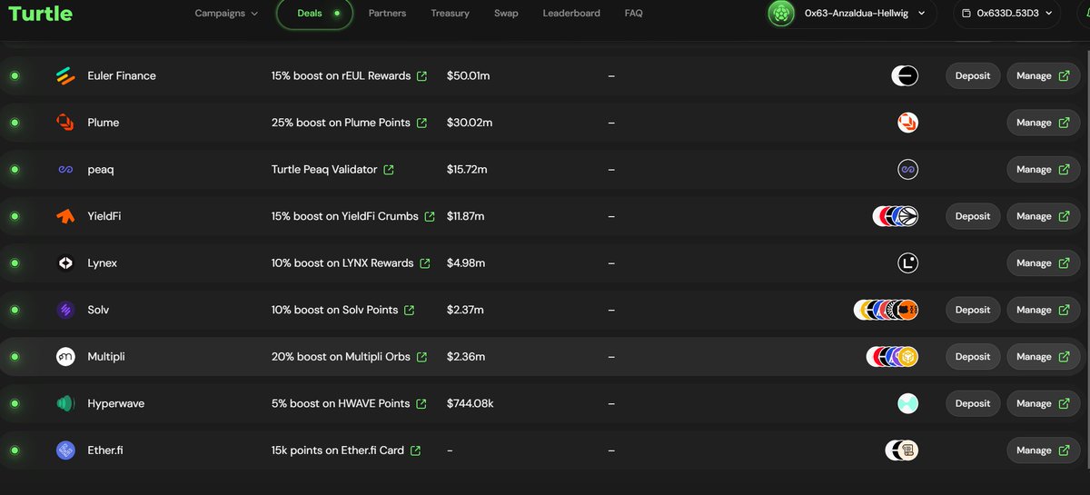 1️⃣ 多链路由与协议互操作:Turtle 已累计路由 50 亿美金流动性**,覆盖 Boosted Deals、Earn 集成、Campaign 活动。跨链和模块化设计意味着未来更多协议和 DEX 都能直接接入 Turtle,流动性能充分被复用。