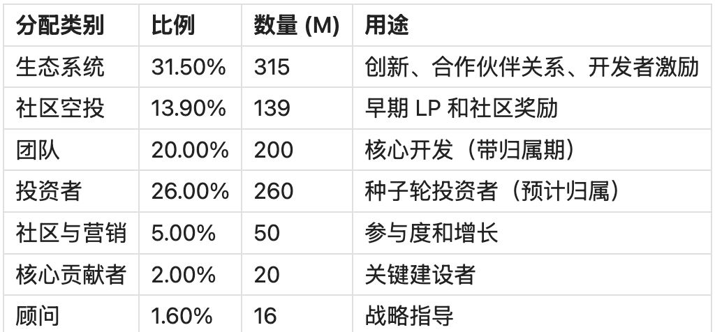 * 分配亮点:生态 31.5%、空投 13.9%(快照还没做,最后窗口)、团队 20%、投资人 26%,剩下给顾问和市场推广