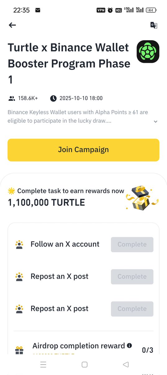 最近 #Binance 钱包在搞事情——@turtledotxyz 推出了 Booster 第一阶段活动,手法很简单:关注官方推特 + 转发两条推文,就能瓜分 1,100,000 $TURTLE,活动截止到 10号,喜欢撸空投的别错过。