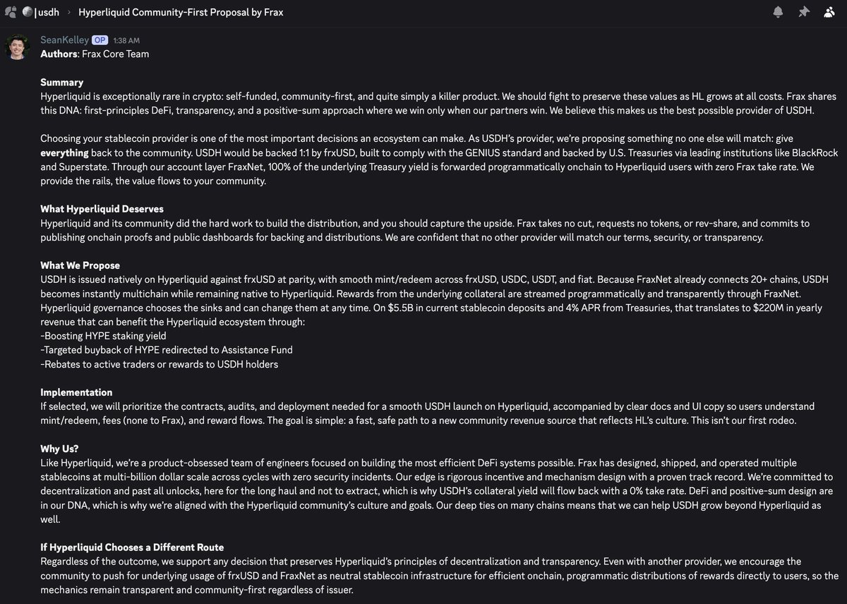 2025 年 9 月 5 日(周五):Hype 官方宣布推出 USDH,并开启发行方竞标过程。