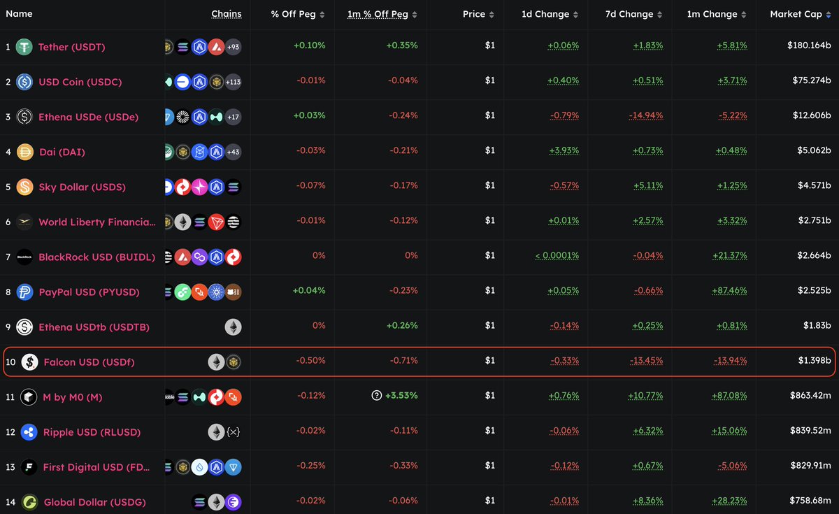 值得注意的是,据Defillama 数据,FF 的稳定币 $USDf 目前市值已触及14亿美元,跻身第10大稳定币,仅次于 @ethena_labs 的稳定币USDTB. 且协议链上数据也出现异动,过去几小时内新增约3亿美元存款。