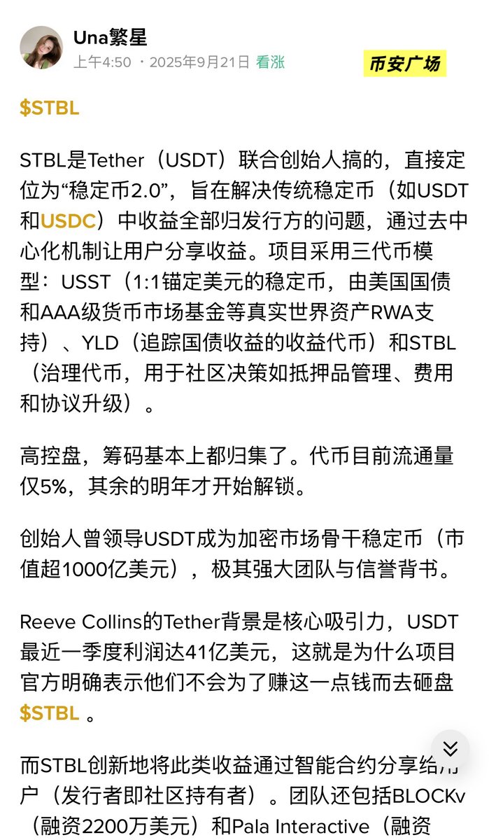 众所周知 $STBL 是 USDT 的联创搞的,直接定位为 稳定币2.0。USDT最近一季度利润达41亿美元。STBL官方非常明确表示他们不会为了赚这一点钱而去砸盘 $STBL ,确实没必要