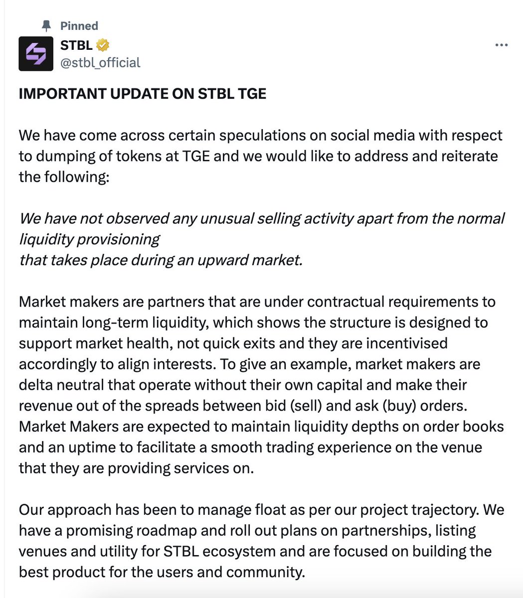 当下市场里,不少项目缺钱就靠卖代币周转,STBL 的做法却相反 —— 官方明确表示,团队及投资人未向交易所转入过任何一枚代币