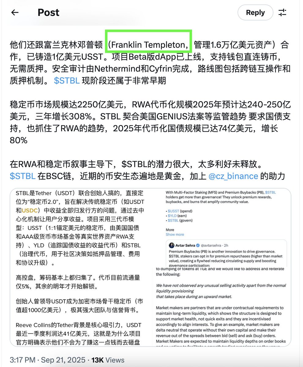 更有意思的是,STBL 的野心显然不止于此。团队已经透露,后续可能会把 BlackRock 的 BUIDL、Franklin Templeton 的 iBENJI 这些代币化基金纳入抵押体系,到时候整个 RWA 层的深度和稳定性会完全不一样。市场上也传出,包括 Franklin Templeton、Wave 在内的多家机构正考虑参与 USST 铸造,潜在规模最高可达 1 亿美元,这说明传统资金已经开始认真看待 STBL 这套模型。