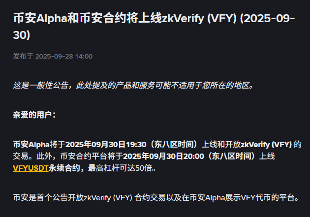 #Binance Alpha 和 Futures 今天都会上线 zkVerify $VFY