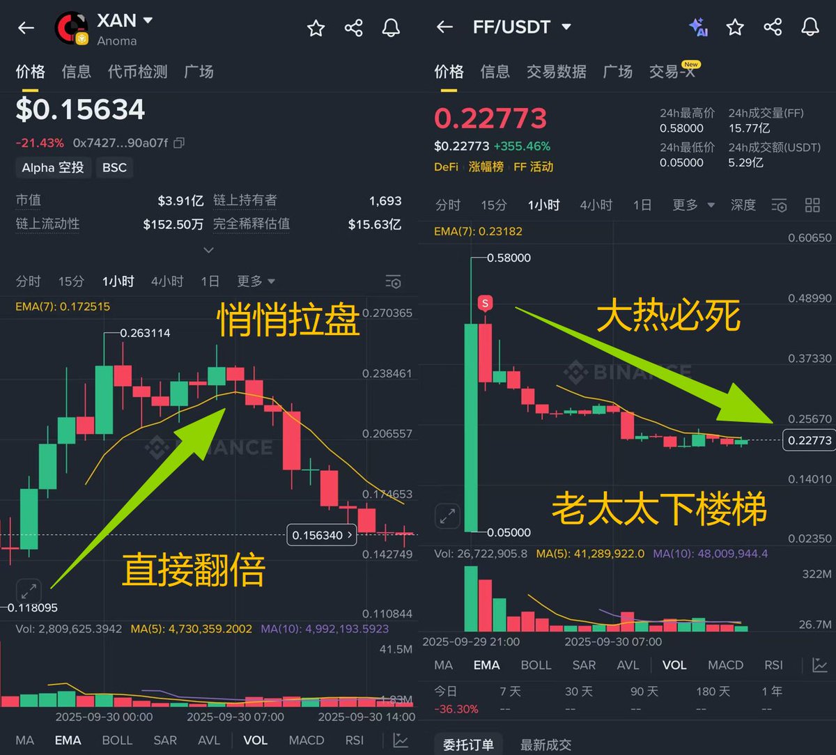 昨天,大热的 FF 开盘在阿尔法,直接拉到了打新的 20 倍,二级现货没有参与机会,除非你是想买进去亏钱,果然从 0.7 跌到 0.2 ,一晚爆跌 350 %,成功浇给 P 小将