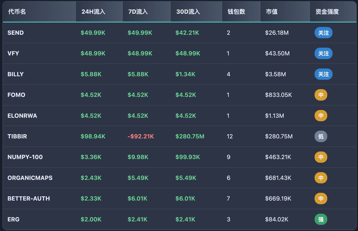 $SEND 聪明钱流入强,但钱包数少,且项目融资信息没有,暂不考虑;
