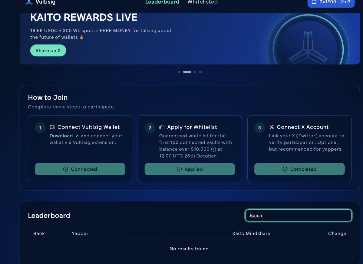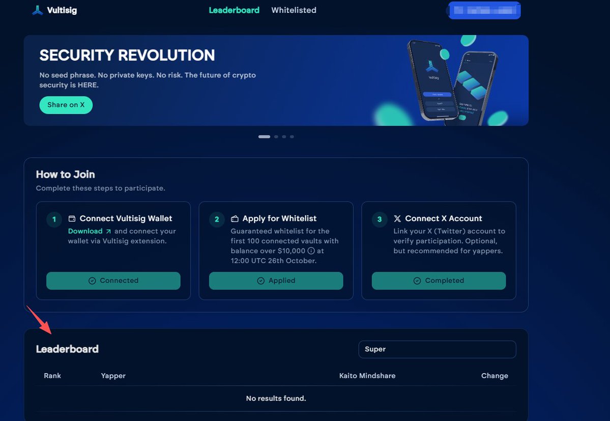 发现整条时间线都被 @vultisig 刷屏了。 有人晒白名单,感觉ICO的热度又回来了。 我一看,这项目起步FDV才 300 万美金,还要在 Kraken 开公开轮,确实香。 但白名单难拿—— KaitoAI 榜单前 300 才行,活动今天结束 想进榜,只能靠不停发高质量内容。 研究了下 Vultisig ,发现它做的是无种子词钱包,用 TSS 技术防丢私钥。 算密钥丢了,资金也不会被盗,还能把备份分放在 Google Drive、iCloud 这些地方。 除了冲榜,还有另一条路: 用 Vultisig 钱包、余额超 1 万美元的前 100 名,会在 10 月 26 日 晚 8 点 快照拿白名单。 所以现在要么冲榜,要么钱包上榜。 无论哪种,华语区该出手了。 #vultisig @jpthor @vultisig @KaitoAI $VULT
