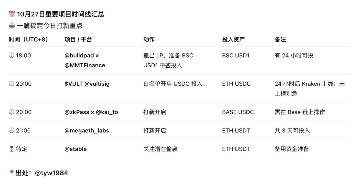 27号重要项目时间线看这篇就够🔥 1️⃣晚上6点 @buildpad 可以撤出 @MMTFinance LP,准备bsc usd1开始投入中签号,有24小时可投 2️⃣晚上8点 $VULT @vultisig 白名单可以开始投入usdc,24小时后kraken上线,现在都没在榜单搜到名字死心了 3️⃣晚上8点 @zkPass kai-to打新,投入base usdc 4️⃣晚上9点 @megaeth_labs 打新,投入eth usdt,有三天时间可以投入 5️⃣ @stable 关注下,准备eth usdt以防偷袭 最后嘴一下 $RiverPts @River4fun #RiverPts 为啥昨天嘴了没分数出现排名还倒退了啊 https://t.co/cSNjQ1sg9F