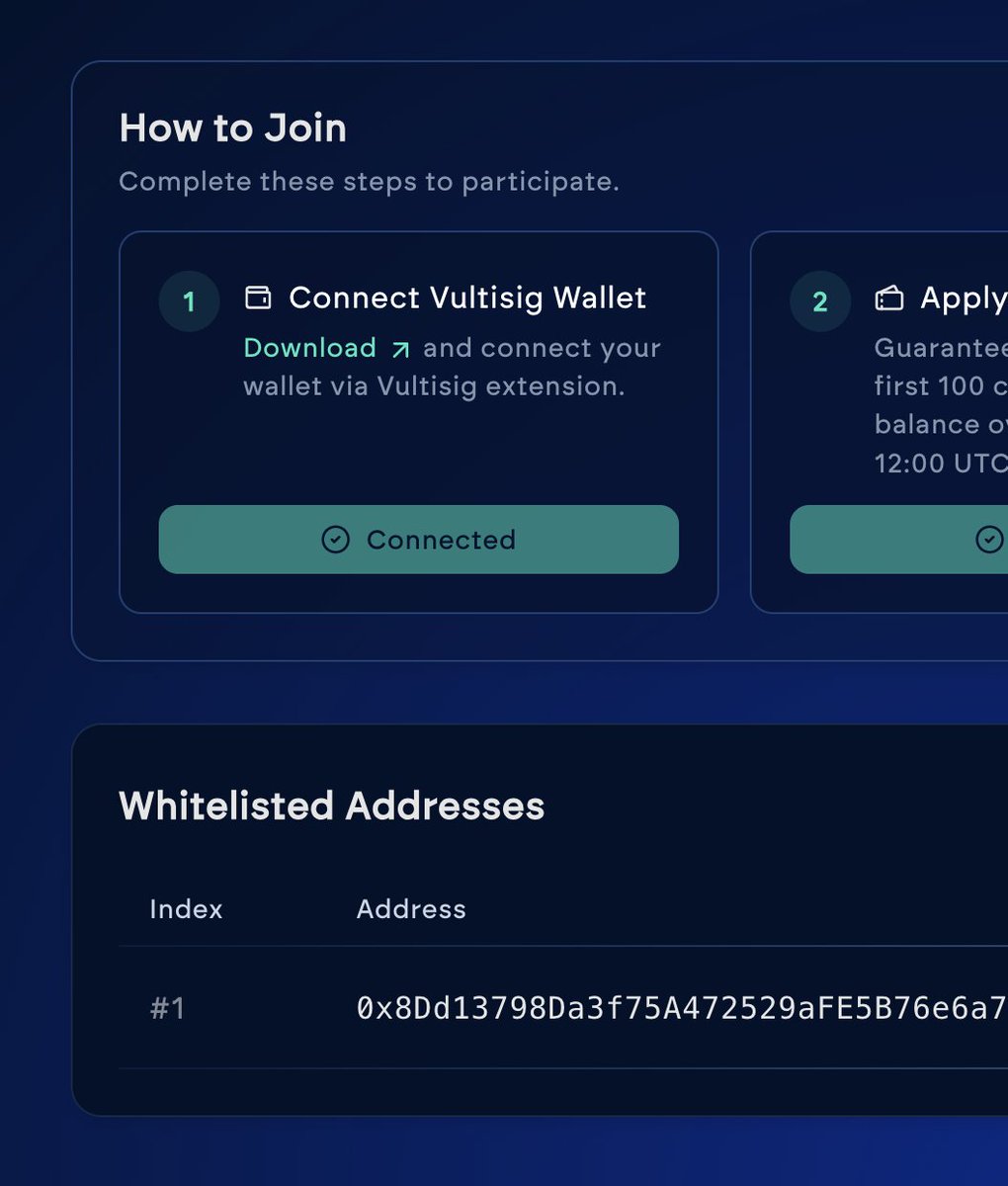 @vultisig打新的具体的时间线 今天晚8,白名单开始塞USDC,总共1500个白名单(光kaito就占了350个) ,晚8-晚9每人最多塞1000USDC ,初始FDV300万 这次打新有点类似于币安的曲线打新和asp早鸟买钥匙那次,并非按金额分配,而是先打成本低,越慢成本越高。 并且是分阶段的,第一阶段也就是前1小时每人最多1000u,第二阶段是直到白名单结束,每个人可以打1wU 算了下如果第一阶段每个人都塞满1000U,那第二阶段的起始FDV就是大概1800万 相较于机构的成本来看还是有的赚的 不过第一阶段打进去就是稳赚(这不就是asp早鸟打新的买卖钥匙阶段嘛) 打新网站:https://t.co/vRmaMZSHuA 上cex的时间是明天的晚8,不知道会不会上alpha,目前币安还没有预告