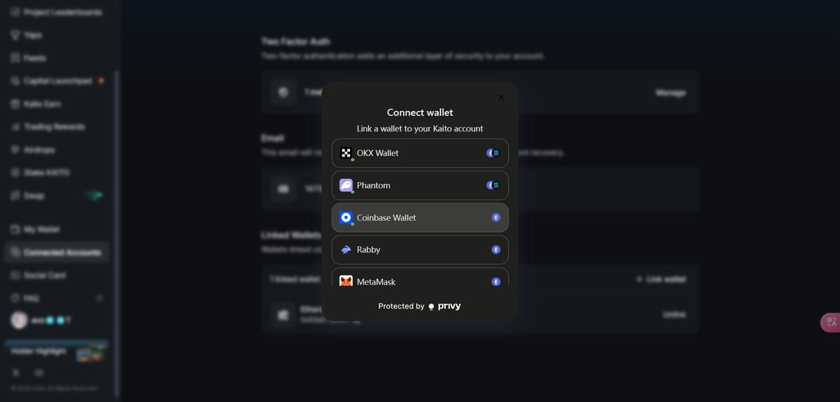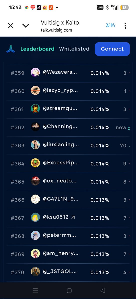 来自 Vultisig @vultisig 的官方提醒~ 请确保你的钱包链接到 Kaito @KaitoAI 上,但是 Kaito 目前好像并不支持链接 Vultisig 钱包? 如何解决这个问题呢? @jpthor @Punk9277 目前 Vultisig 依旧霸榜 Kaito 所有语言占比:16.17% 中文棒占比:28.54% 英文榜占比:10.10% 其他榜占比:19.67% 英文区的热度慢慢降下来了,但是中文区还在火爆进行中,只能说国人太能卷了