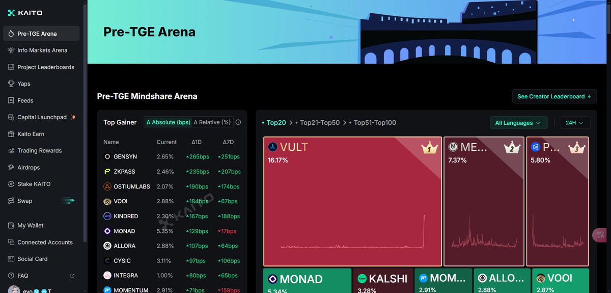 令人兴奋的合作伙伴关系公告! 🎉 @vultisig@KaitoAI 合作推出 Mindshare 排行榜,为前 300 名社区成员提供 USDC 和独家白名单访问权限。 $VULT 启动前确保席位的最后机会👇 (CMC 实验室:合作伙伴)