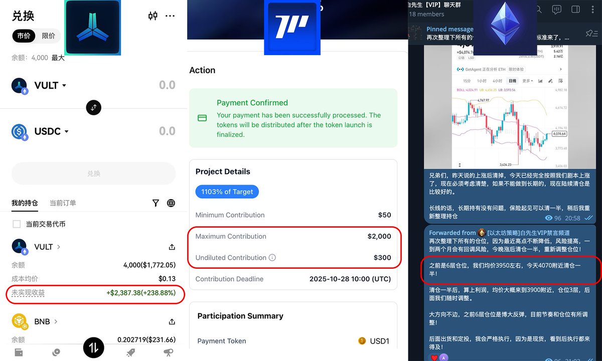 关于 Vultisig @vultisig 发售的相关信息~ Vultsig 发售分为三个阶段: 第 1 阶段(白名单阶段),10 月 27 日晚上 8 点: 所有 WL 地址都有资格在第一个小时内购买高达 1,000 美元的 USDC $VULT 第 2 阶段(白名单阶段),10 月 27 日晚上 9 点: 所有 WL 地址都有资格在接下来的 23 小时内购买高达 10,000 美元的 USDC $VULT 第 3 阶段(公开阶段), 10 月 28 日晚上 8 点:在 @kraken 日启动,所有限制都解除。每个人都可以随心所欲地购买。 Vultisig 初始发售价格为 3M FDV,白名单总共有一千多个。 Vulting 的发射和普通的预售不一样,它的价格不是固定的,Vulting 的发射模式和 Four @four_meme_ 的发射模式一样,买得越早价格越低,曲线发射 第一阶段和第二阶段相对于是内盘,只有白名单能购买,第三阶段相对于发射了,所有人都可以进行交易,所以即使你有白名单,也要早点去抢更低的价格