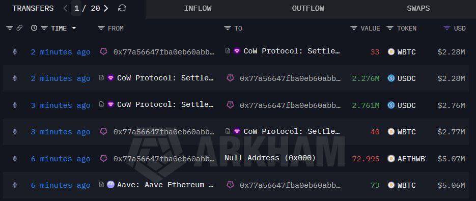 他们刚刚从 #Aave 中提取了 162.69 $WBTC(1498 万美元),并将 27.12 $WBTC(250 万美元)交换为 770.6 $ETH。