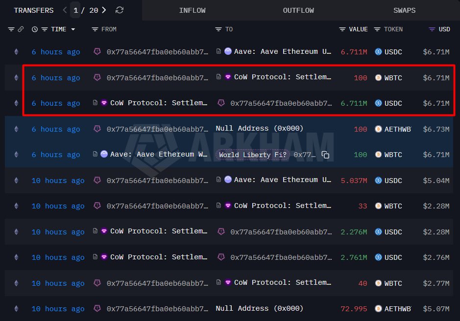 World Liberty Finance ( @worldlibertyfi ) 又以 671 万美元$USDC的价格出售了 100 $WBTC 。