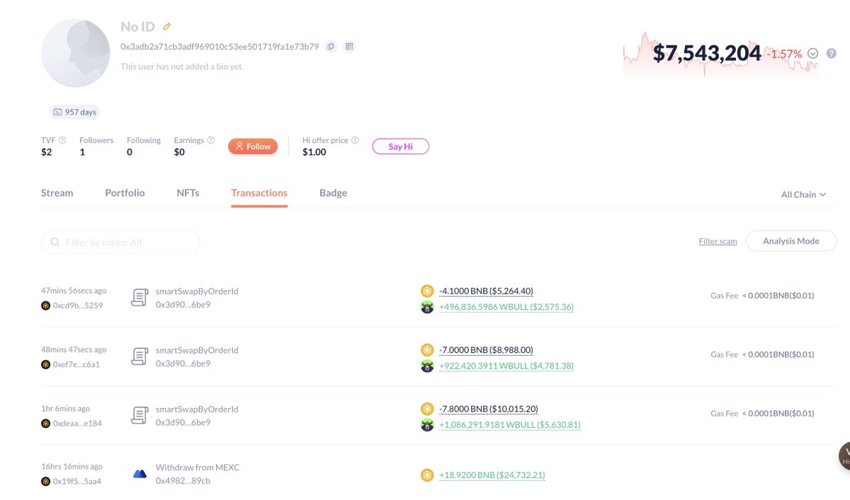 鲸鱼 0x3adb 持有 750 万美元的资产,大约一小时前从 #MEXC 提取了 18.9 $BNB(24.7K 美元),并购买了 251 万 $WBULL(现在为 26K 美元)。