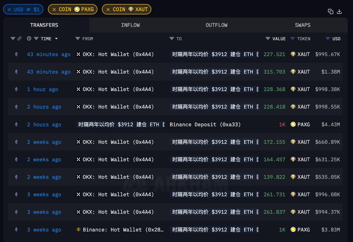 🔹XAUt:过去三周以均价 $4095.88 建仓,现已浮盈 55 万美元