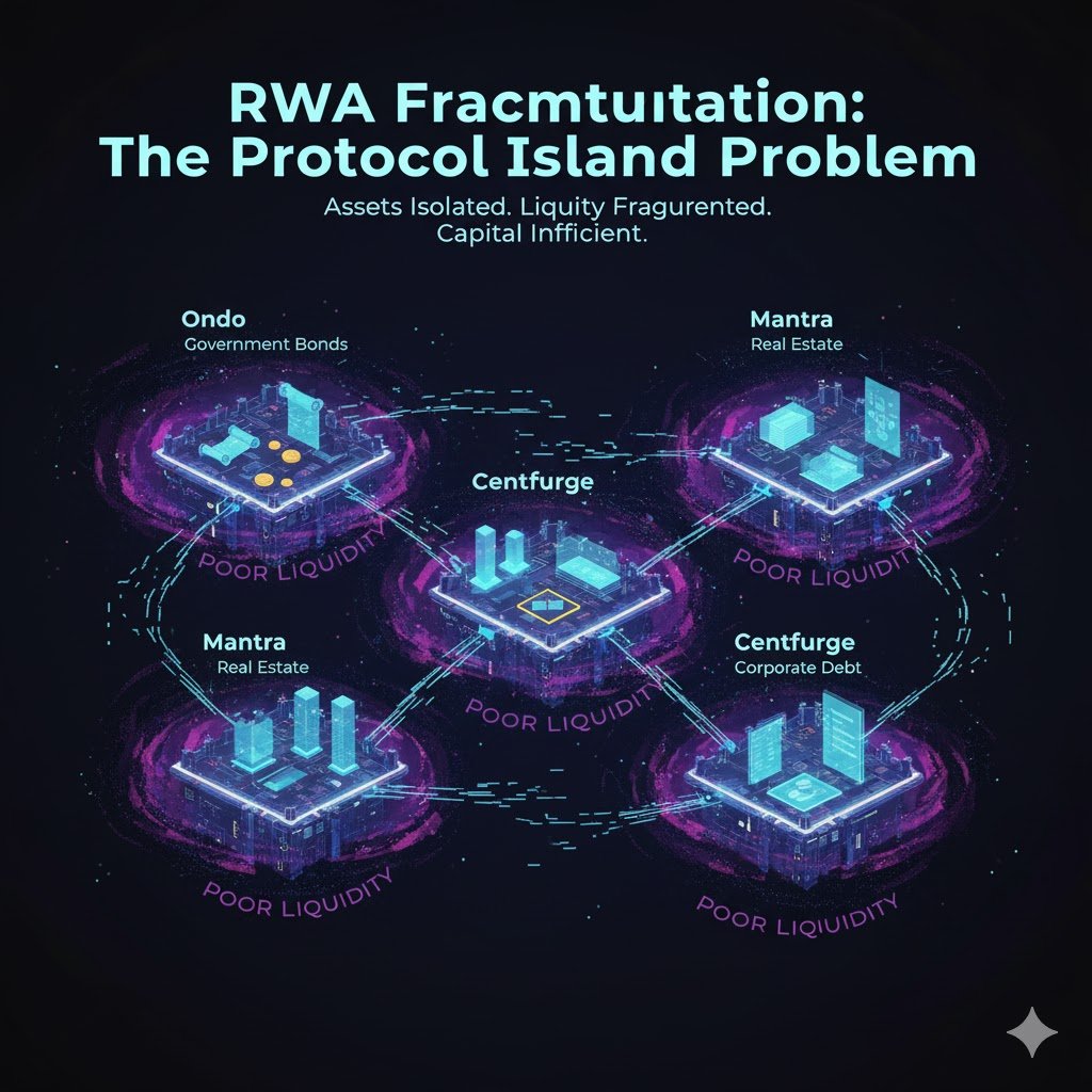 国债在 Ondo 上,房地产在 Mantra 上,企业债在 Centrifuge 上……每个协议都是一座孤岛,资产不能互通,流动性差得要命。
