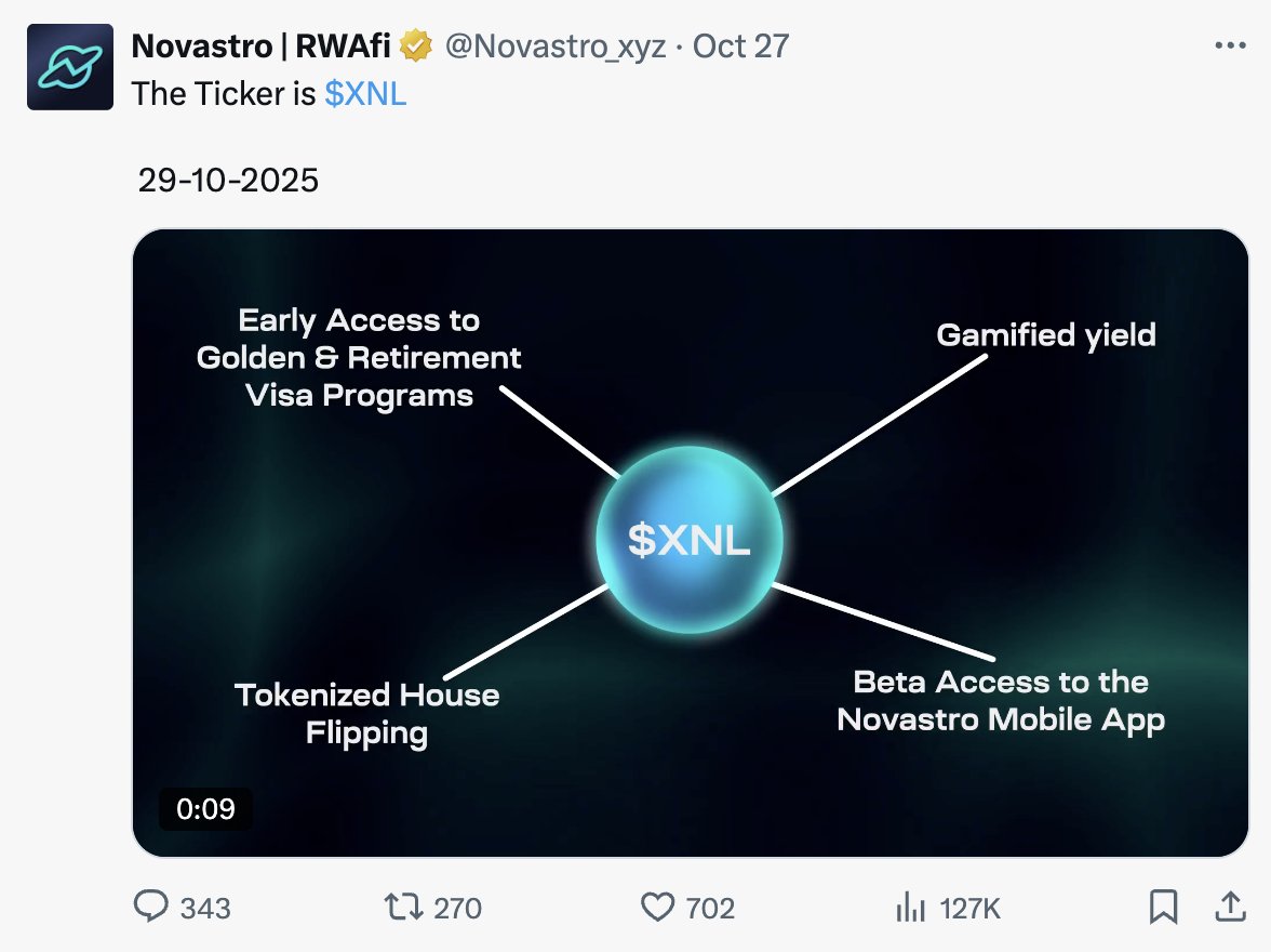 RWA协议 Novastro @Novastro_xyz 定于明天 10/29号TGE,等太久了,目前已经确定上了 Kucoin、Gate、Mexc等二线交易所,挺不错的!