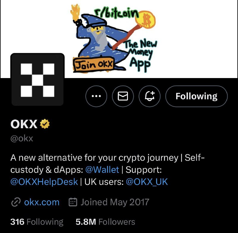 OKX 大号 @okx 昨夜凌晨更换了比特币小巫师 meme 横幅图,应发社区热议。讽刺的是,其正宗符文代币 $MIM 没见任何动静,而其 OKX 的 XLayer 链上却诞生出一个叫 $Xwizard 的土狗代币一飞冲天,市值最高冲到 4M 多美元。(当前的 OKX 横幅已更换回去了)