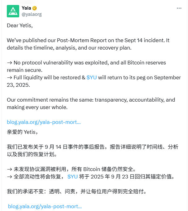 →全面恢复流动性, $YU将于 2025 年 9 月 23 日恢复挂钩。