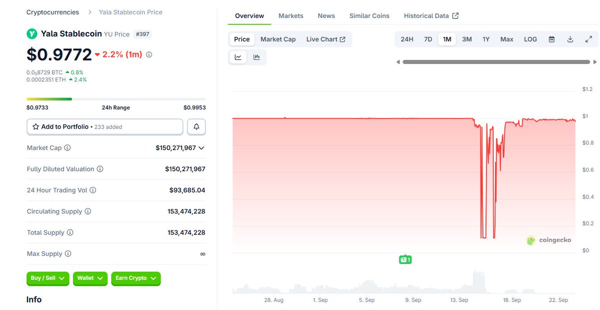 后续:看到 @yalaorg 官方发了公告说,要在 23 号重新给 $YU 注入流动性,今天 23 号 $Yu 已经基本回到 0.98-0.99 了。