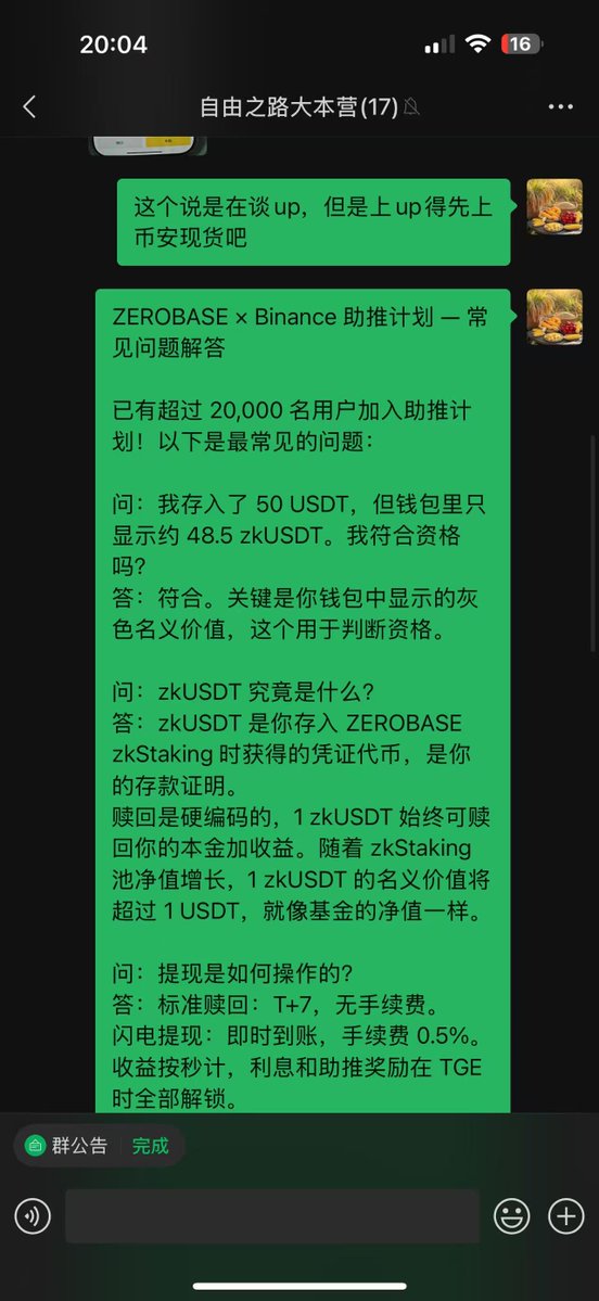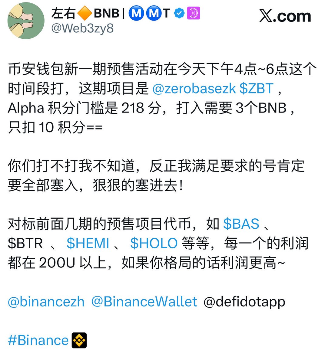 今天睡醒看见群里都在讨论币安Booster活动第一期的代币 @zerobasezk 空投跟今天的 Alpha涨幅不错 @zerobasezk 上了upbit和binance spot主站,估计收益会很不错,一个小时后币安现货开交易,Alpha已经可以交易了 HODLer 空投1.5%的额外奖励已经发放 Booster第一季的2000万枚 $ZBT 正在发放 项目方空投直接给35万多个地址发福利,而且没有锁仓 Booster 第一期活动的代币市值是按照 80M 给的,开盘如果有 800M 的话就是理财年化暴涨 10x 目前在 Base BSC ETH 三条链上,已经开了 1U 了 FDV 1B,半小时以后开合约,2 个小时后币安现货 + Upbit 开盘,HODLer 空投又有额外 1.5%,初始流通 6.5% 只能说群友们参与的都麻了,最后简单介绍下这个项目 ZEROBASE (@zerobasezk) 是全球首个零知识证明网络,专注于真实收益验证。 通过ZK技术构建可验证信任层,支持高效证明生成与验证,已吸引超14万用户,TVL超5.34亿美元。