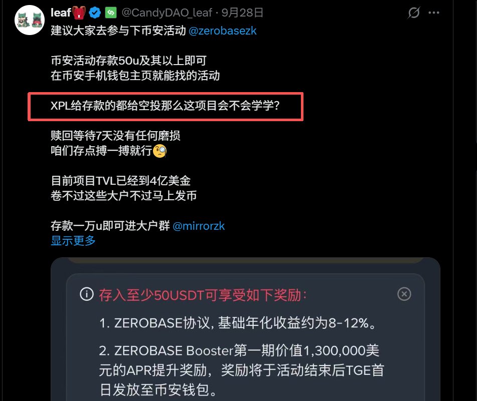 币安活动的 @zerobasezk 这波都赚不错 老板 @mirrorzk 是比较格局的而且直接中文沟通 存款50u即可得到30u的空投奖励 存款越多空投越多年华能达100%以上 用户的空投ZEROBASE直接免费分发 分配规则也考虑小散成本👇 (1)拥有≥ 10 ZBT 的用户在ETH链 (2)拥有 <10 ZBT 的用户在 BSC链 最重要的是项目方不查女巫所有用户都有资格 这直接点赞一波👍 蛋糕分不分够不够的是博弈的事情 只要没有女巫那真的是直接格局 第二期 $ZBT 还没结束年化 18%可以继续参与