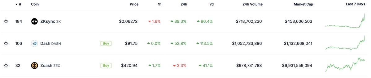 11.隐私匿名赛道大涨, $ZEC $ZER $DASH $XVG $ZK 都拉起飞了;