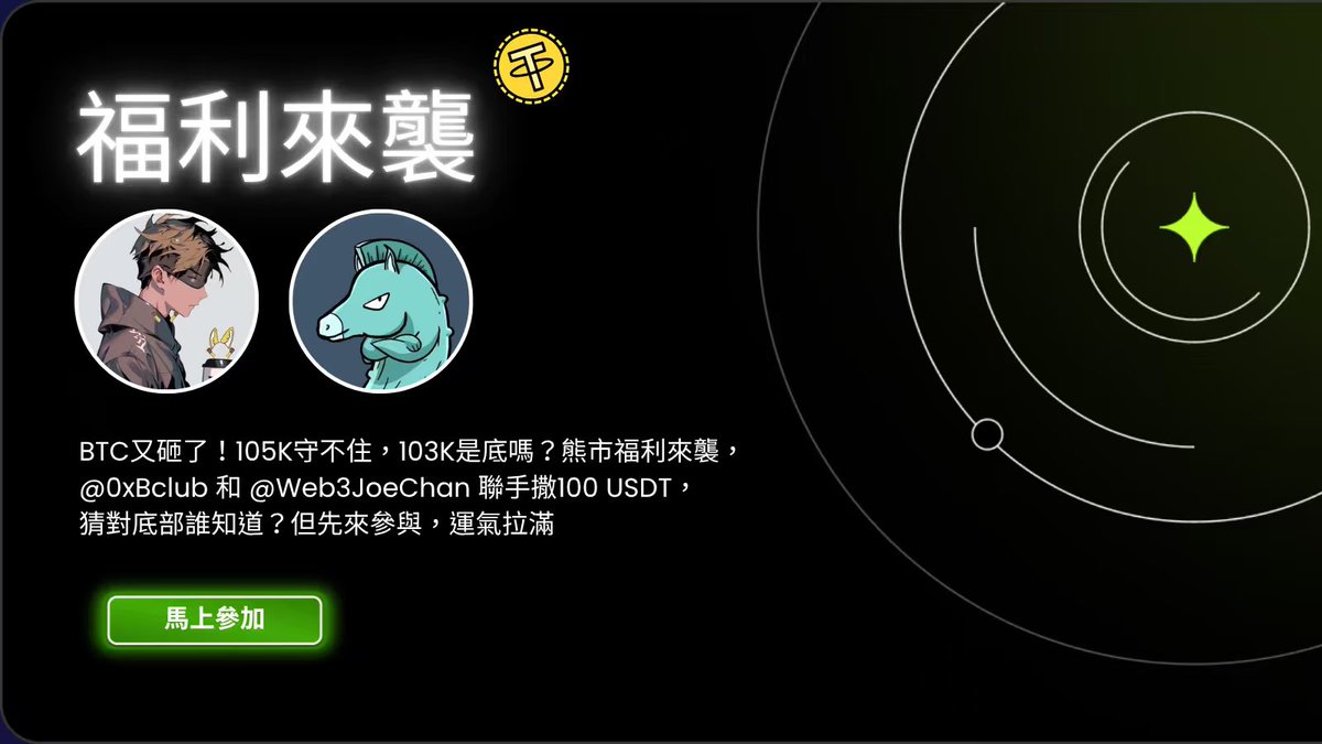 105K 感覺有點岌岌可危,103K 會是底嗎?熊市限定福利來了,我跟 @Web3JoeChan 贊助 100 U 給大家當競猜獎勵玩玩。