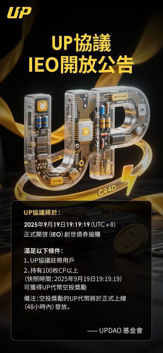 兄弟们,UP Protocol 的 创世债券IEO即将首发! 🎁抽50u X 10人分 1️⃣关注 @UPProtocol_Web3 2️⃣钱包登录 https://t.co/jOHf8SLXNY ,留下连接的截图即可 IEO参与方式很简单: 1️⃣注册成为UP Protocol 用户 2️⃣钱包中持有至少100个 $CP (就是CoinUp的平台币) 本次创世债券销售 启动时间:9月19日: 19:19:19 (UTC+8) 然后坐等官方空投大礼包! Let's go👉 https://t.co/jOHf8SLXNY