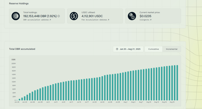 根据仪表盘显示,迄今为止储备基金已累计回购 2.45% 的 DBR 总供应量,约 2.45 亿枚 $DBR ,国库储备金总量34M,持续增长