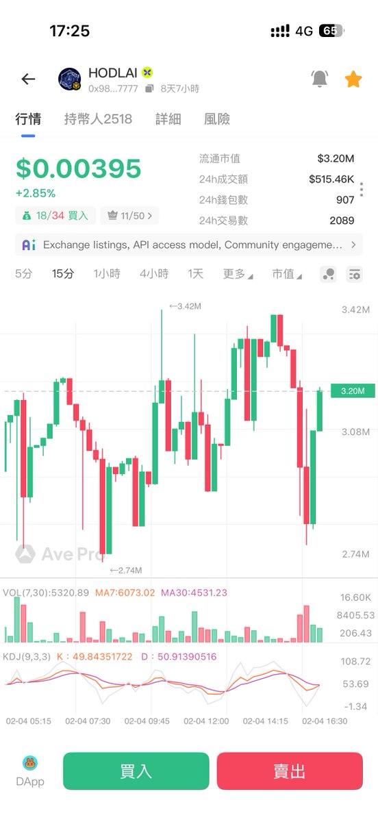Base 的ai 大回撤 Bnbchain 的ai龙头正在小步慢行中 $hodlai 的k线和市值就像这个项目本身一样 在代码完善和社区建设两个方面都在稳步向前 Dev 还在持续的coding 中 或许下一步会加入额度转让交易? Hold住