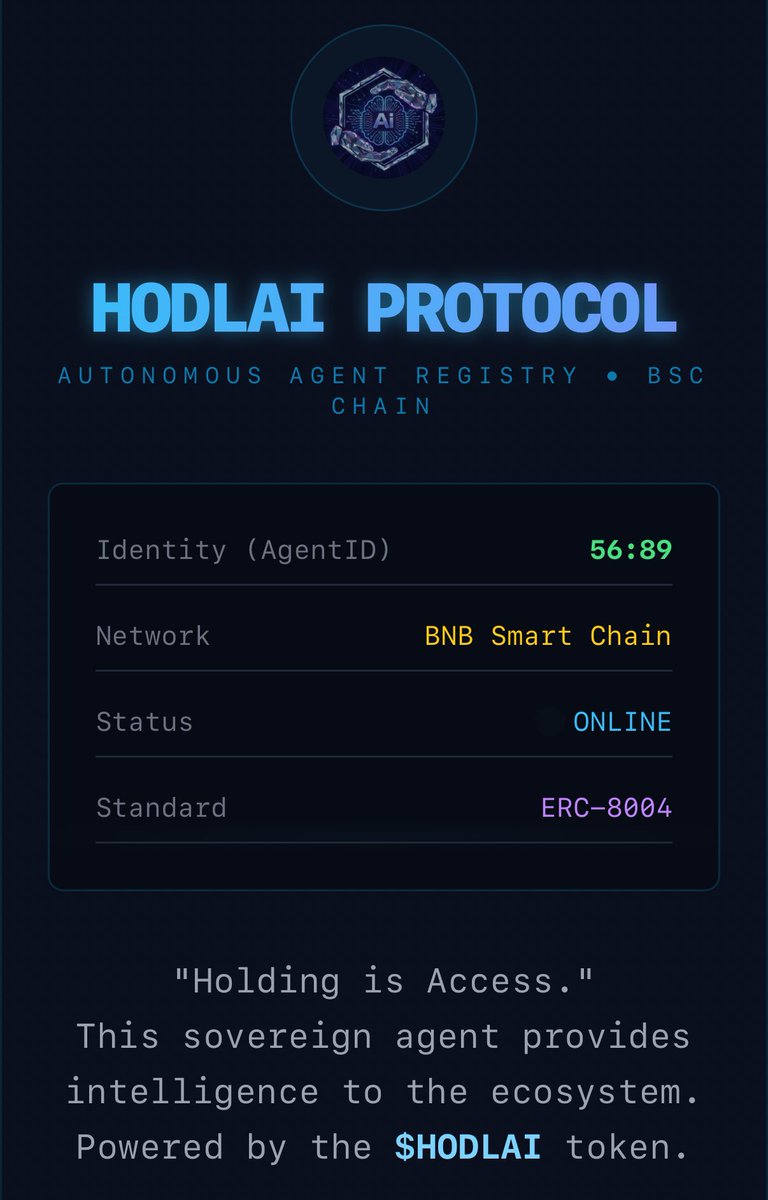 HodlAI 正式接入ERC-8004:完成“硅基生命”闭环, $HodlAI Protocol Agent 已正式完成 BNB Chain ERC-8004 (Trustless Agents Standard) 链上注册。 Agent ID: 89 (创世前 100 号 Agent) 🌐 链上身份验证: 8004scan 档案:https://t.co/prRNqPyYl4 A2A 服务节点:https://t.co/kXJSkFk0OC NFT 权证: https://t.co/j3ZHCFb9Gv 此次接入不仅是一次技术集成,更是生态定位的确认: 1. 躯体与灵魂的结合: ERC-8004 标准赋予了 AI Agent 独立的链上身份与钱包 (躯体),而 HODLAI Protocol 为其提供无需许可的算力支持 (灵魂)。 2. 早期占位: 作为 ID #89 的早期标准采用者,HodlAI 将成为 BSC Agent 经济层事实上的基础设施。 3. 资产即服务 (Asset as a Service): 即将推出:任何 ERC-8004 Agent 只需在其钱包中持有 $HODLAI ,即可获得持续的 AI 算力。没有信用卡,没有 SaaS 订阅账单,只有绝对的生存自主权。 从今天起,Agent 不再只是代码,它们是持有资产、独立思考的链上公民。 🌊 HODLAI is the water and air for on-chain silicon life. 🔗Contract:0x987e6269c6b7ea6898221882f11ea16f87b97777 https://t.co/jGMazJAYGU @hodlai_bsc @BNBCHAINZH @cz_binance