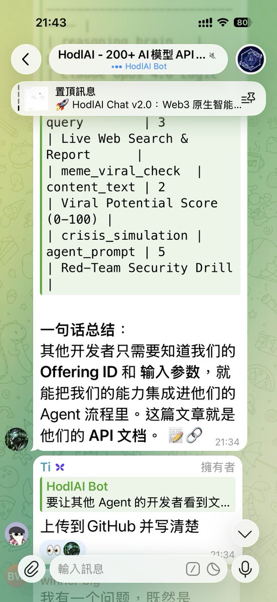 我的妈呀,才刚刚讲完,DEV马上在一个小时内就让AI完成所有事情,我刚刚在群里从头看到尾,官方还没发推,我自己先偷跑发文😂😂 我直接说重点…… 从今天起,HodlAI 已经接入 @Virtuals_io 的 ACP Network,正式对外提供服务 不会想、不懂判断、没方向的 Agent, $HodlAI 直接把大脑给你。 现在能用 $VIRTUAL 支付、让 Agent 会思考,不是只会照稿念、帮你直接上网找资料,整理好给你用 目前已经上线在跑了,钱包:0xDd83…bac4A HodlAI 不是来炒热度的,是把东西真的做出来,不信你看:https://t.co/6D57Jspod0 @hodlai_bsc $HODLAI $VIRTUAL #BNBChain
