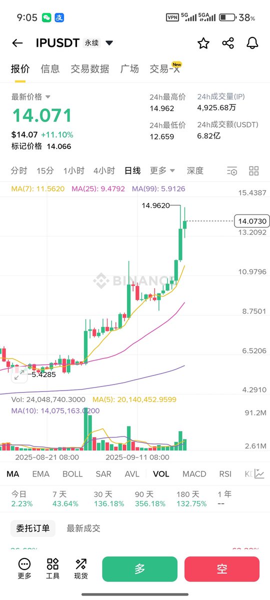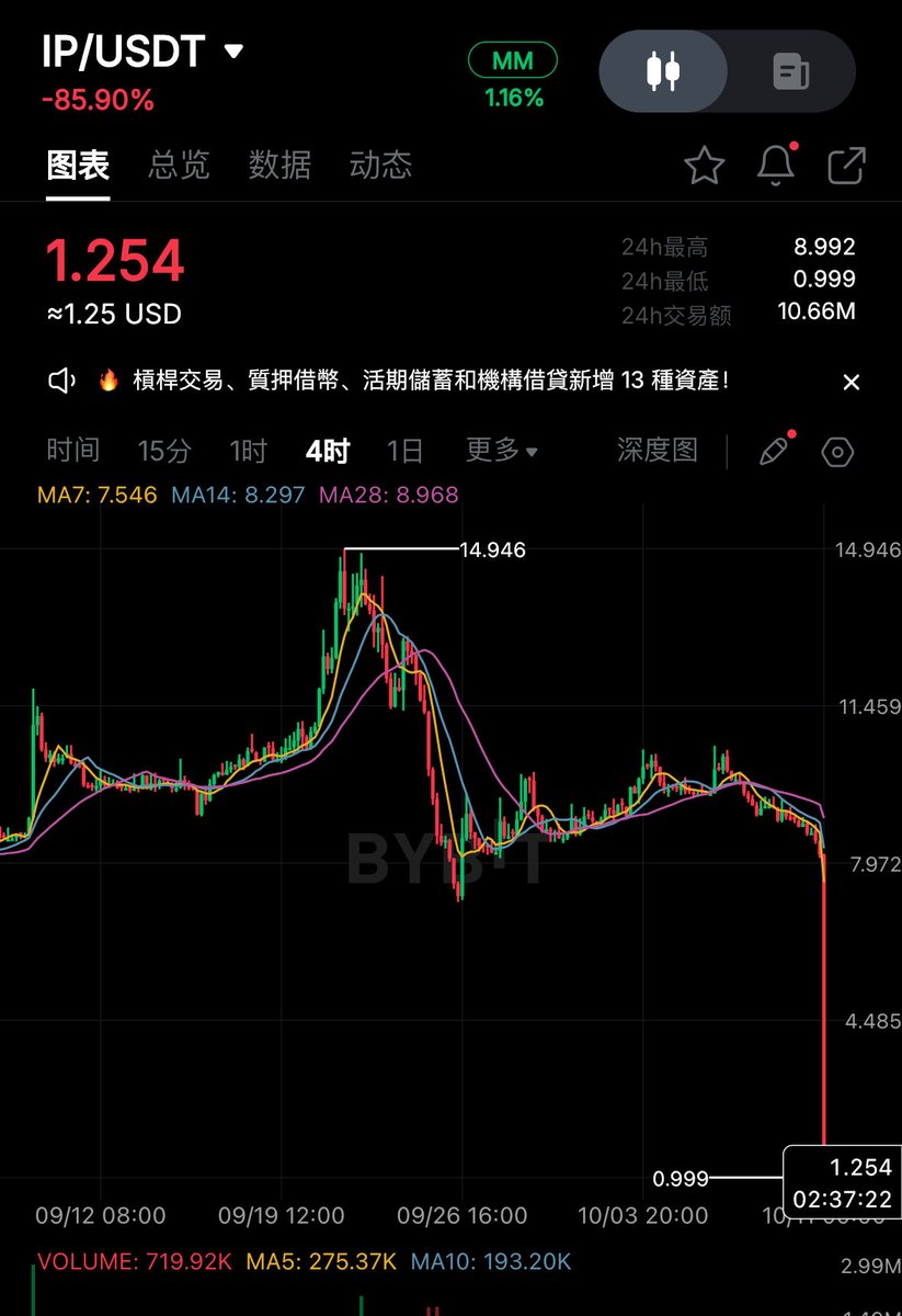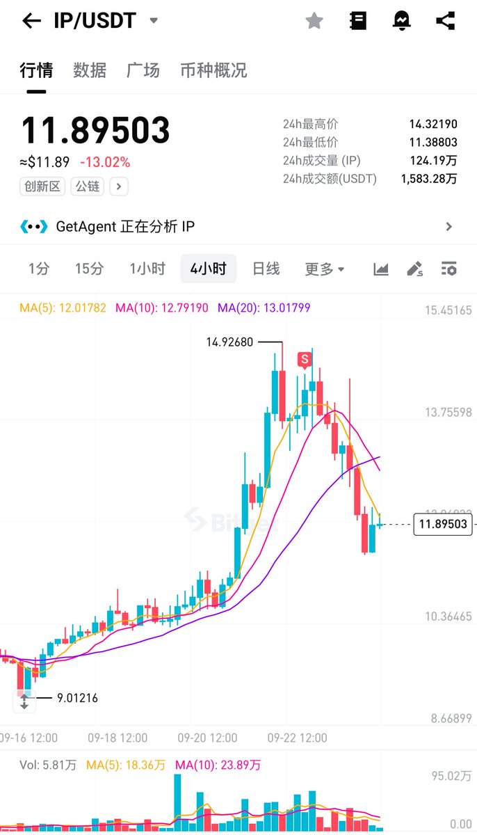 实在话,我之前一直都是喊多的 但是最近我觉得可以空一手了 $IP 空的理由: 1、过去一段时间拉的太猛了,拉的时候有多猛,砸的时候也会有的 2、整个大盘目前并不稳定,到底怎么走,我个人还是比较保守 有的会持仓,有的就不会持仓 3、随着KBW大会的结束,下一步的动作目前还需要观察一下 比如波塞冬的动作和IPWORLD的动作 跟着趋势走,该多的时候不要犹豫,该空的时候也要果断 PS:我前几天卖的,今天才想起来分析一波,大家可以判断一下是否有继续下跌的趋势 个人仍旧趋于保守