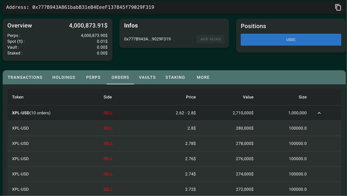 好有趣的地址: $XPL 盘前现价 $0.8232,今早他在 [$2.62 - $2.8] 区间挂了 271 万美元的限价卖单 该地址归属于 @0x58bro,你说他看好吧,他的主地址 58bro.eth 正在做空价值 400 万美元的 XPL,开仓价格 $0.0.7811(当然不排除是在套保);你说他不看好吧,挂了个高于市价这么多的卖出价格🤣 这位朋友看起来是个做空大户,主地址做空了 $ASTER / $ENA / $IP 在内的 11 个热门代币,目前浮盈 440 万美元,其中 4 负 7 正 传送门 👉 https://t.co/sswNBvKhAD