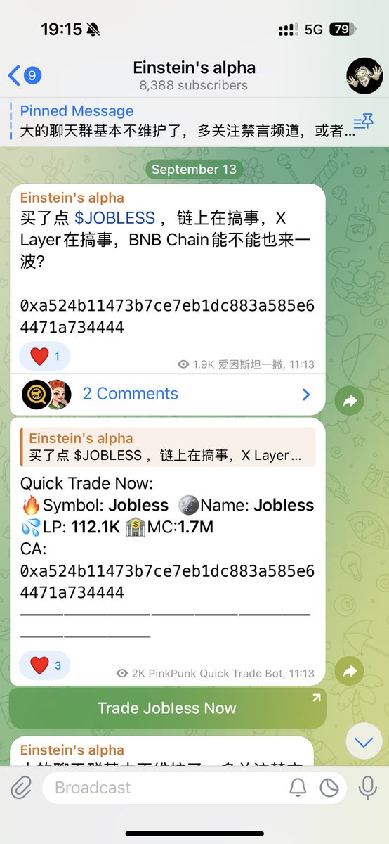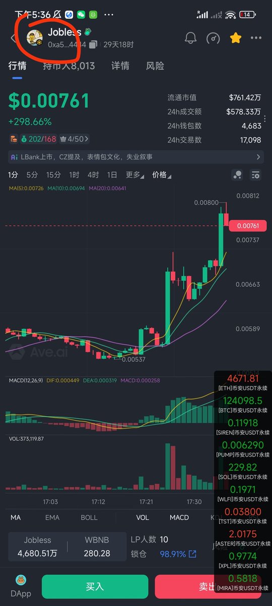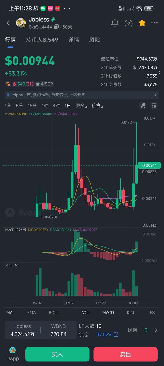 整天说我赚钱不给你们密码,说我马后炮,说我让你们接盘 结果 8 号下午我就把 $JOBLESS 摆到你们眼前了,反复喊:买失业,不失业! 后来 11 号我又提过一次,今天最高直接冲到 10M,现在也稳在 8M。 跟我一起上的,起码都翻了四倍了吧? 我还是那句话,这种热度、这种节奏,10M 肯定不是顶。 继续看好,继续干! #JOBLESS #BSC #XLayer