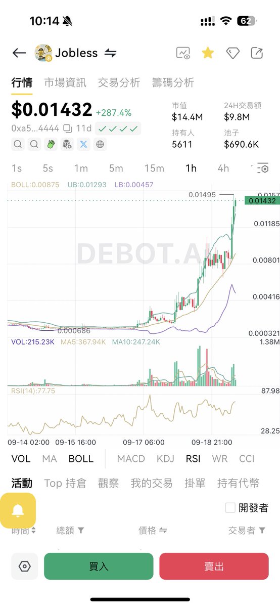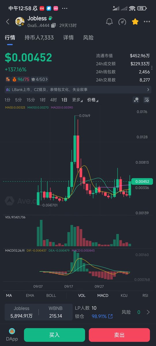 $jobless 刚买了1%jobless,希望有福报。 0xa524b11473b7ce7eb1dc883a585e64471a734444