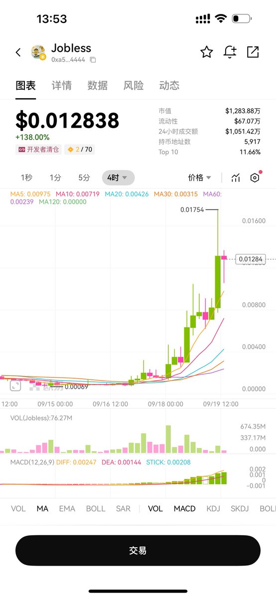 $JOBLESS 0x89cbfbe8a79ca871311fe0bdc0f8c5cf3c7c4444 大写 正版 失业正确名字的OG代币 失业的内涵是失业这个词 首先名字正确肯定是基础 这个币前高17万 我刚发推时候2万 刚才涨了5倍到10万了 距离我说的20万10倍就仅差一步之遥 刚才10万被纸手砸下去了 现在又跌到5万多了 我现在是不想CTO任何币了 我在CTO方面也能力不足 水平有限 希望有心人士可以CTO这个币 我可以免费为这个币嗷嗷叫 希望先有人能建立一个电报群 然后建立一个官推 然后评论区留言 我给你转发 先把买了这个币的人给聚集起来 大家一起建设OG拼写正确的大写失业