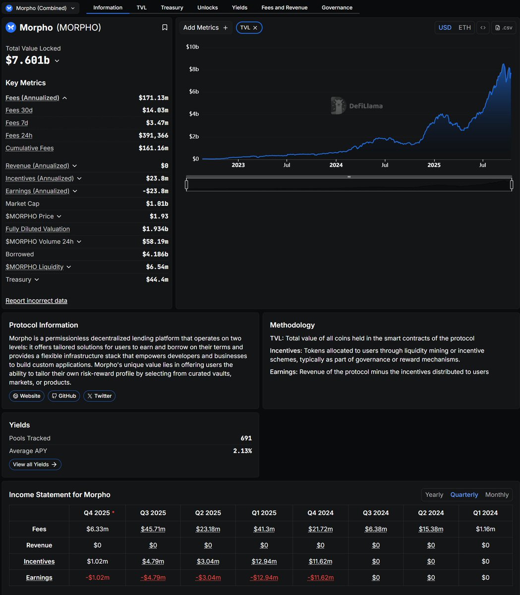 根据Defillama @DefiLlama 数据显示,Morpho目前锁仓量(TVL)已突破 70 亿美元,稳居新一代 DeFi 借贷协议的前列,并且Morpho Labs 累计融资 超 6800 万美元,战略轮价格约为 0.74 美元/枚。