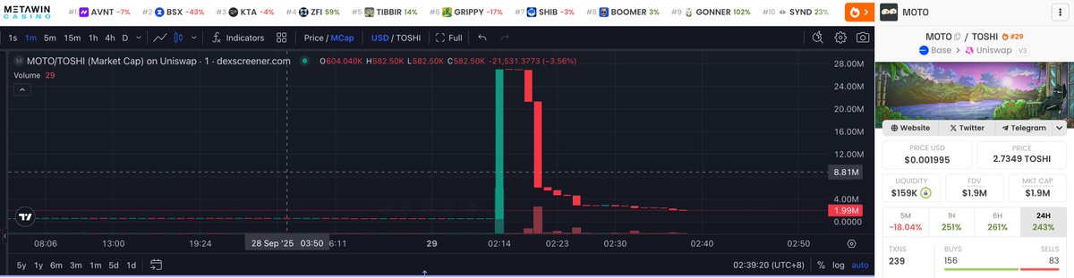 刚才链上看到一个奇葩的事 有个老哥花了价值26wu的 $TOSHI 买了 $MOTO 然后MOTO代币旱地拔葱 500k直接上到28M 估计手里有货的刚才出货出麻了 现在被砸到2M了 这老哥还没出货 这个 $MOTO 就是 $TOSHI 做的pump @toshimart 的龙一 用的TOSHI做交易对 目前不知道这个老哥是按错了还是怎么 这亏的妈都不认识了 我感觉他可能纯手滑了 这是真做慈善了 节哀吧 $MOTO 0x9a9de07629EF283c2d700eFD3958f59B7d528453 这里围观老哥的地址 0x9c38a43f4955f6ef159b859caa45f763d98af147 K线这里看 https://t.co/qEWMLfwjOg