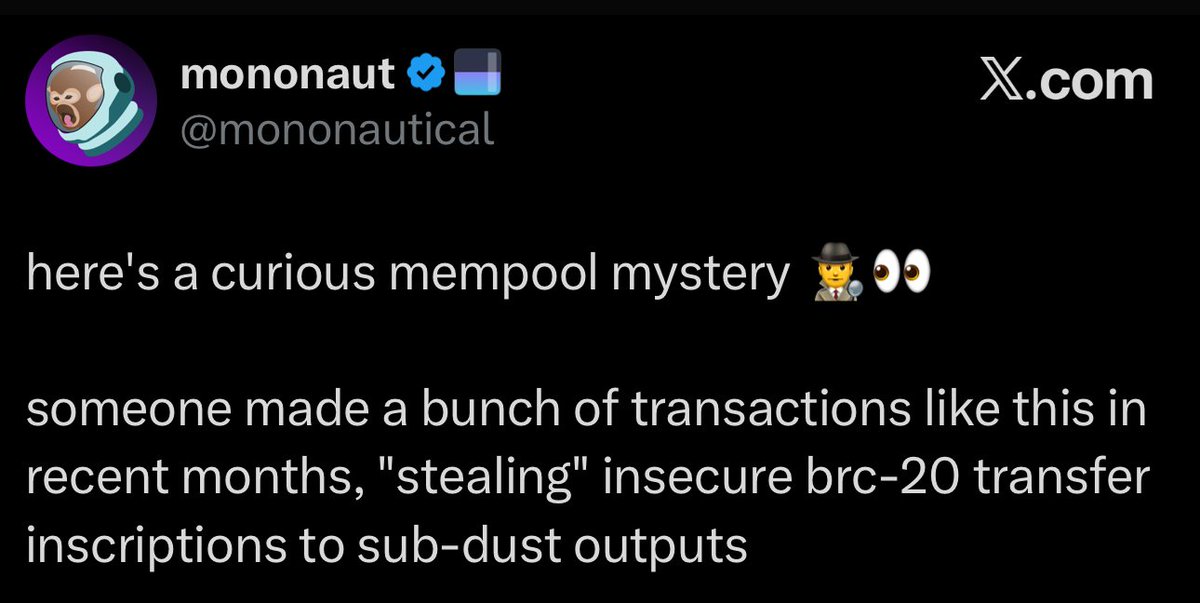 @mononautical 指出,近期有人利用 RBF 机制“窃取”不安全的 BRC20 转账铭文,这些转账被发到没签名的超小额 UTXO(也就是尘埃输出)。并分析这些交易缺少 OP_CHECKSIG 校验码,允许后续交易用极少数据替换签名,从而导致转账在 Unisat 等索引器上标记为失败,他怀疑与闪电网络锚点整合及矿池私有通道有关。