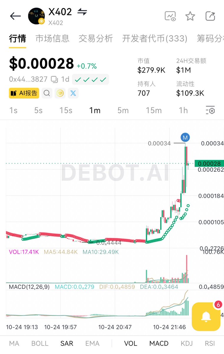 扯远了,再说x402,今天链上还是围绕于此,周末p的热闹的的 $x420 又翻倍了,因为x420新做了个x402 专门 launchpad,x420格局还是挺大的,可能要做ai之间的pvp平台。然后币安官方转推了几个在bsc上做x402的项目,包括 @Unibase_AI @pieverse_io @AEON_Community @termix_ai ,这里面已经发币的就是 $u402 ,fdv 2.8m ,bsc上另一个x402项目是 $peng fdv 2m 。
